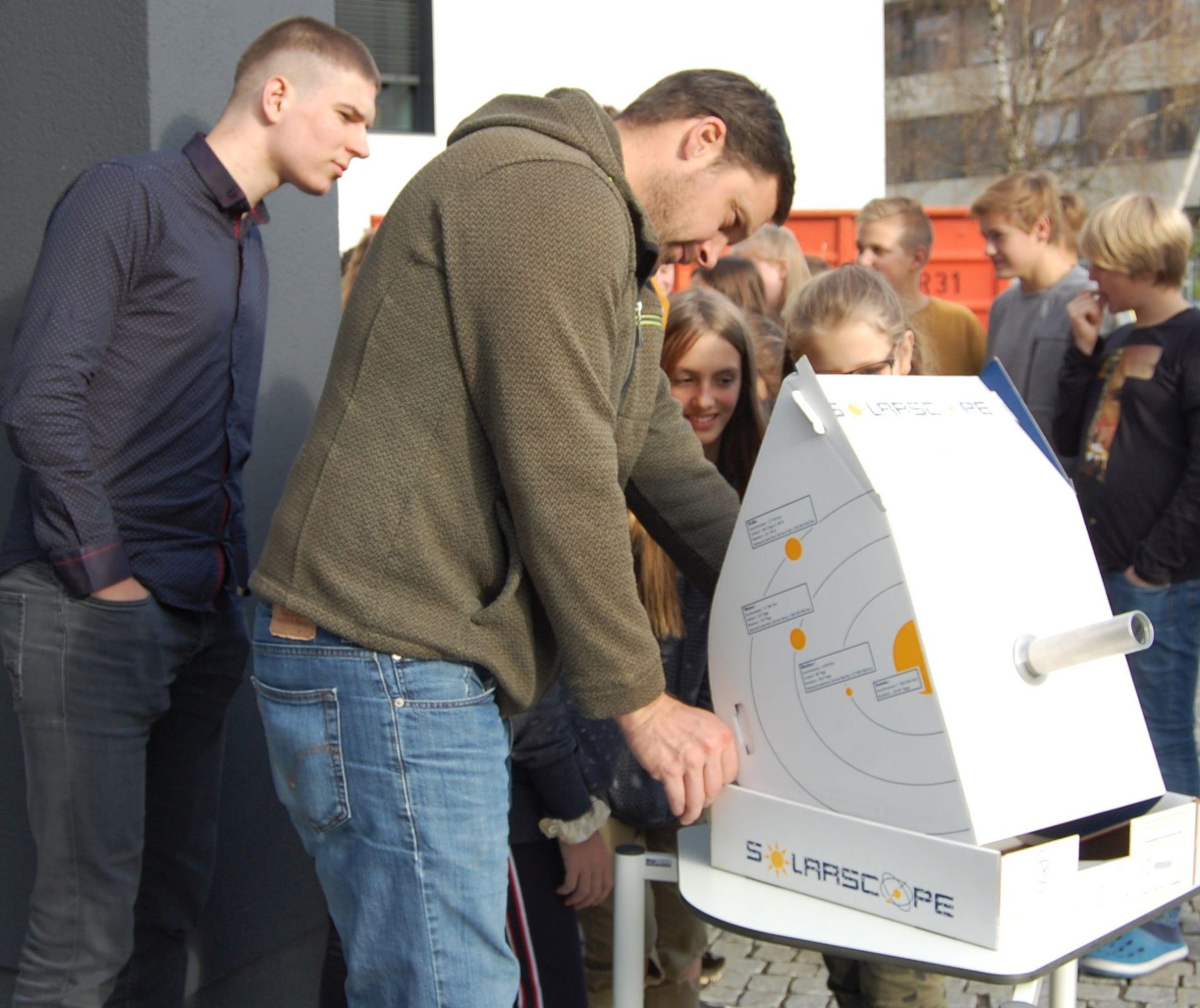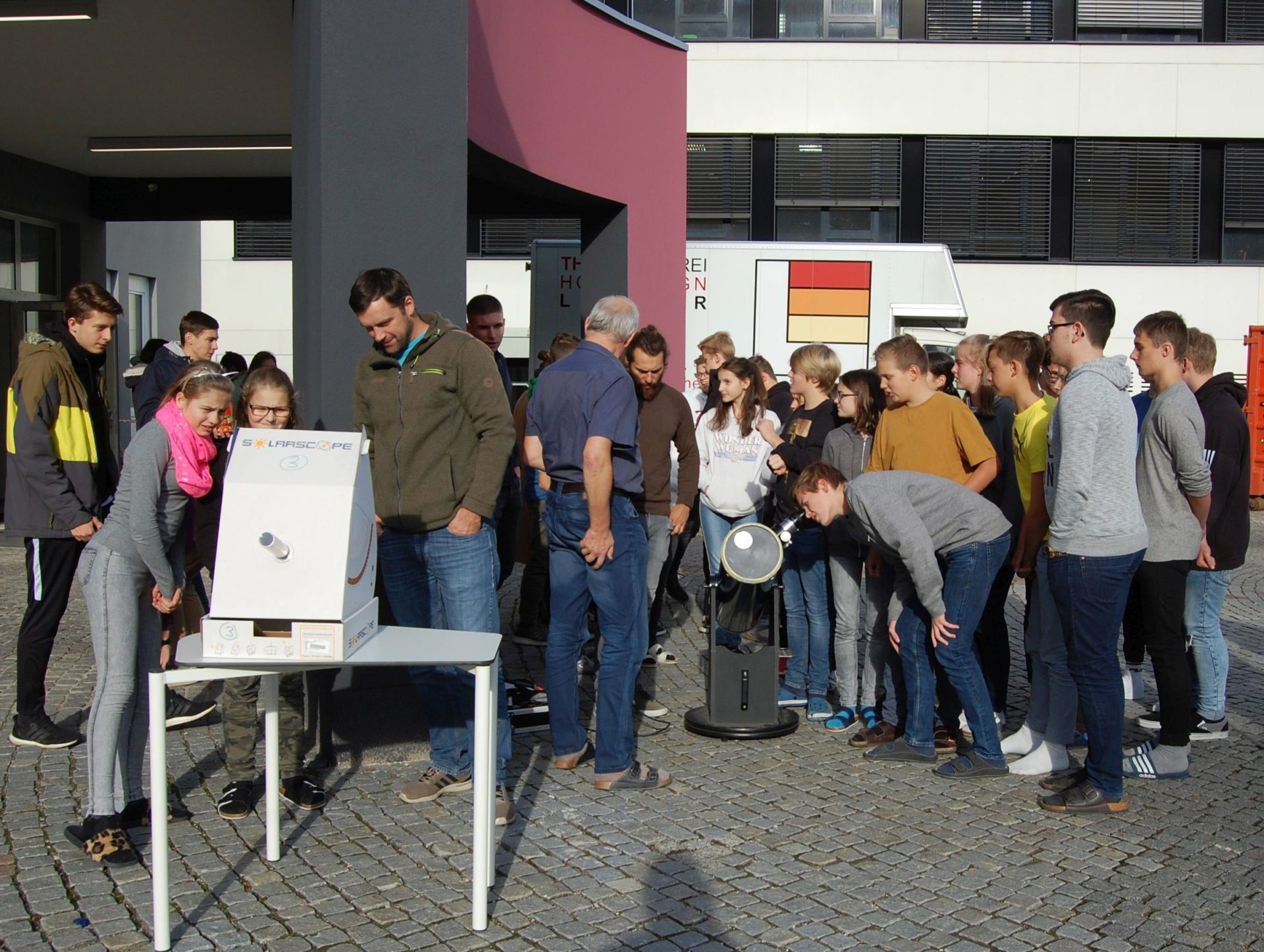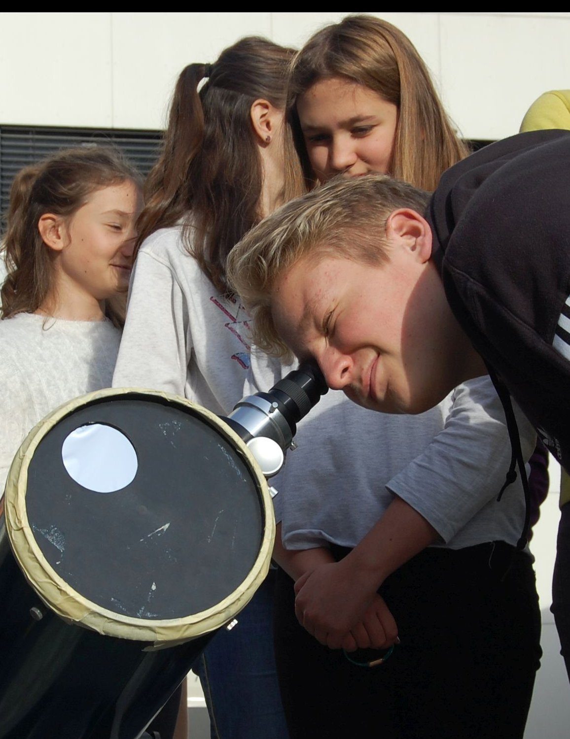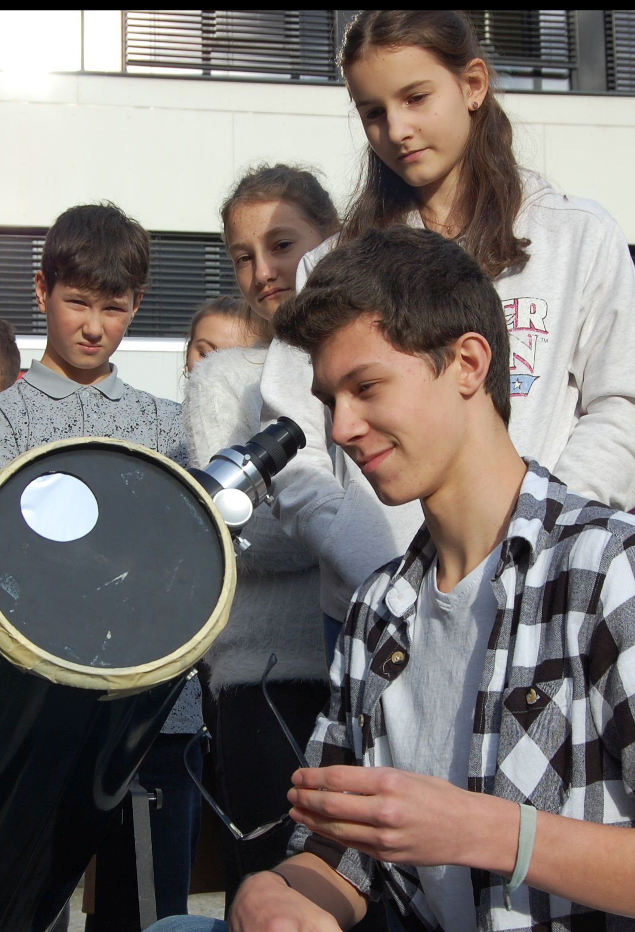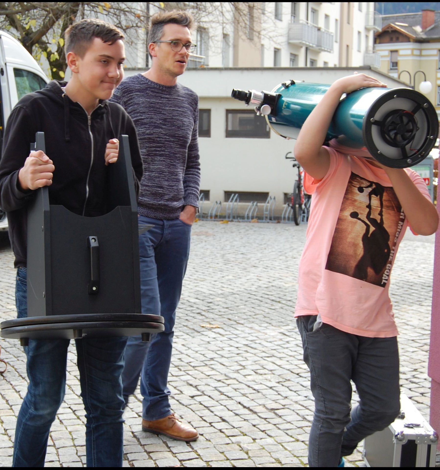15. November 2019Mit ausgesprochenem Wetterglück konnte gestern (Montag 11.11.2019) der Merkurtransit vorm Haupteingang der Spittaler Gymnasien perfekt beobachtet werden. Der „Schulastronom des BRG“, Mag. Michael Samitz, hatte den Lichteinlass seines 8-Zoll-Dobson-Teleskopes zuvor gemeinsam mit SchülerInnen der 4G mit einer speziellen Beobachtungsfolie versehen und dann das Gerät sowie ein Solarskop (Projektionsschirm) der Schule in Richtung Sonne in Position gebracht. Kurz vor Beginn des seltenen Spektakels lichteten sich die Wolken und etliche LehrerInnen und SchülerInnen, die noch Nachmittagsunterricht hatten konnten einen Blick auf den kleinen schwarzen Punkt werfen, der sich gemächlich vom Rand der Sonnenscheibe nach innen bewegte.