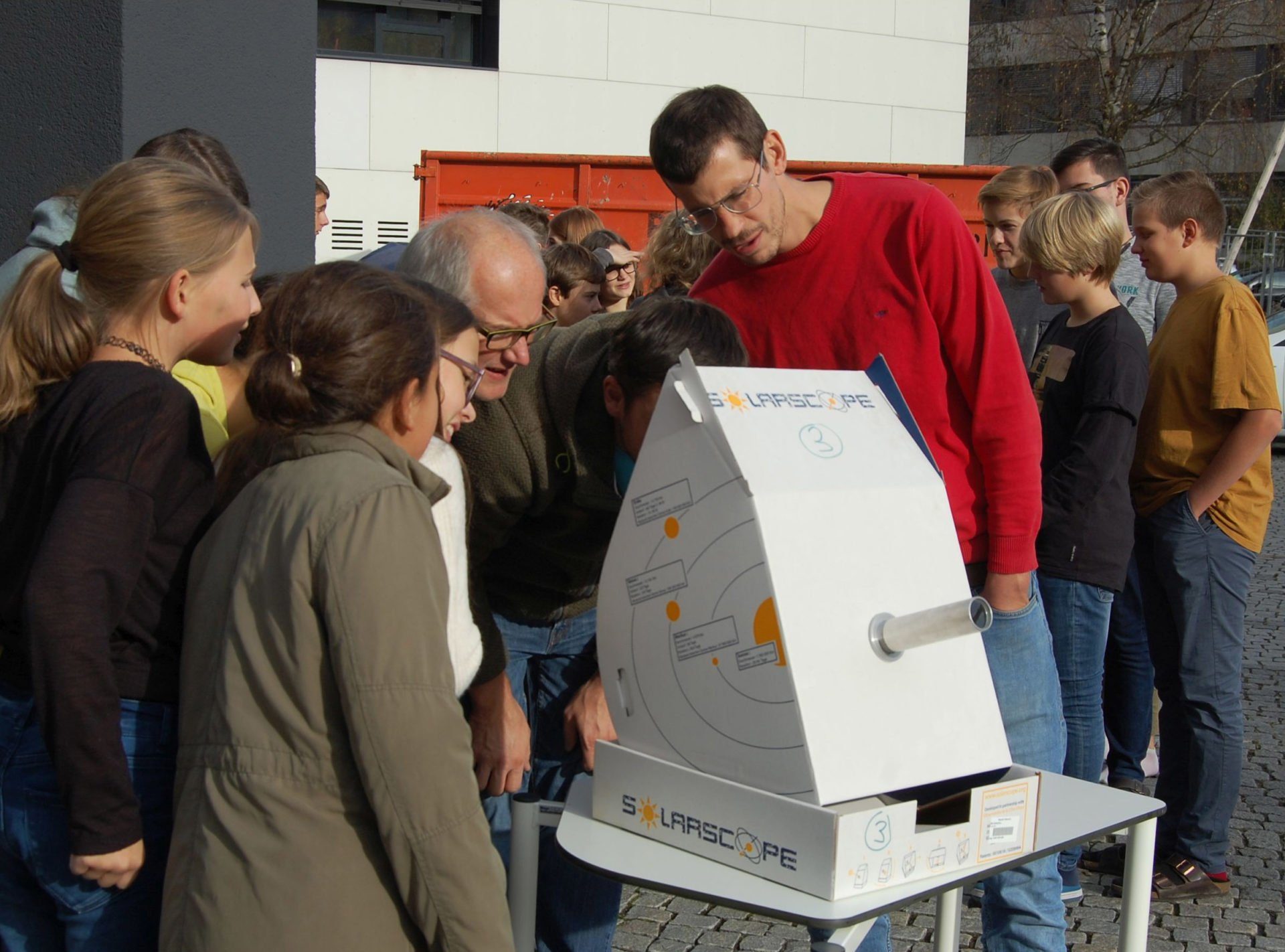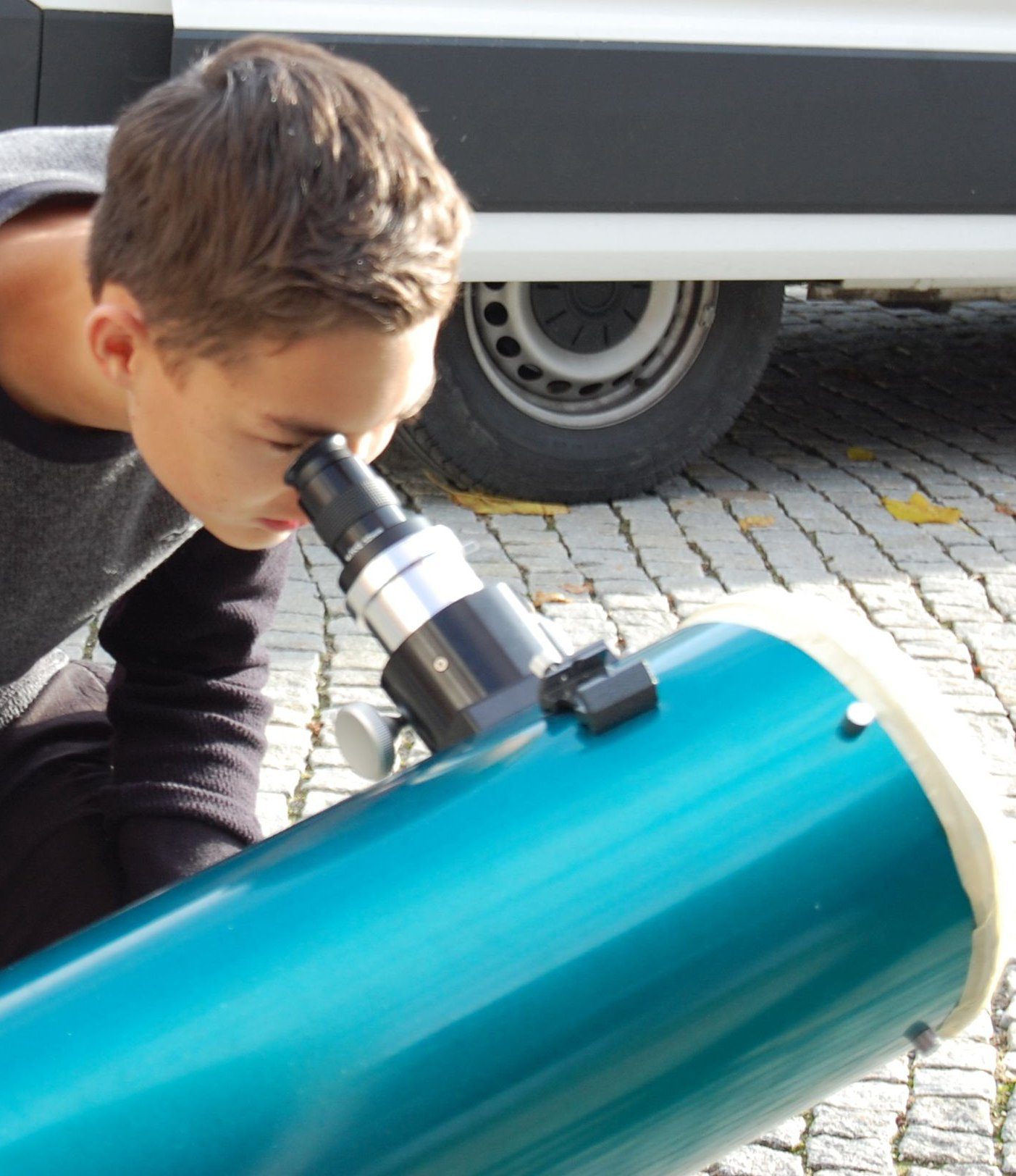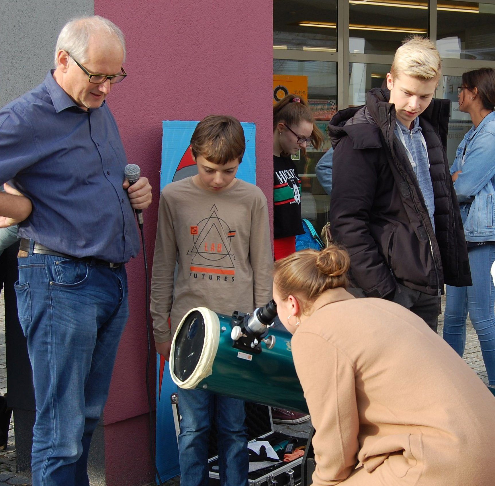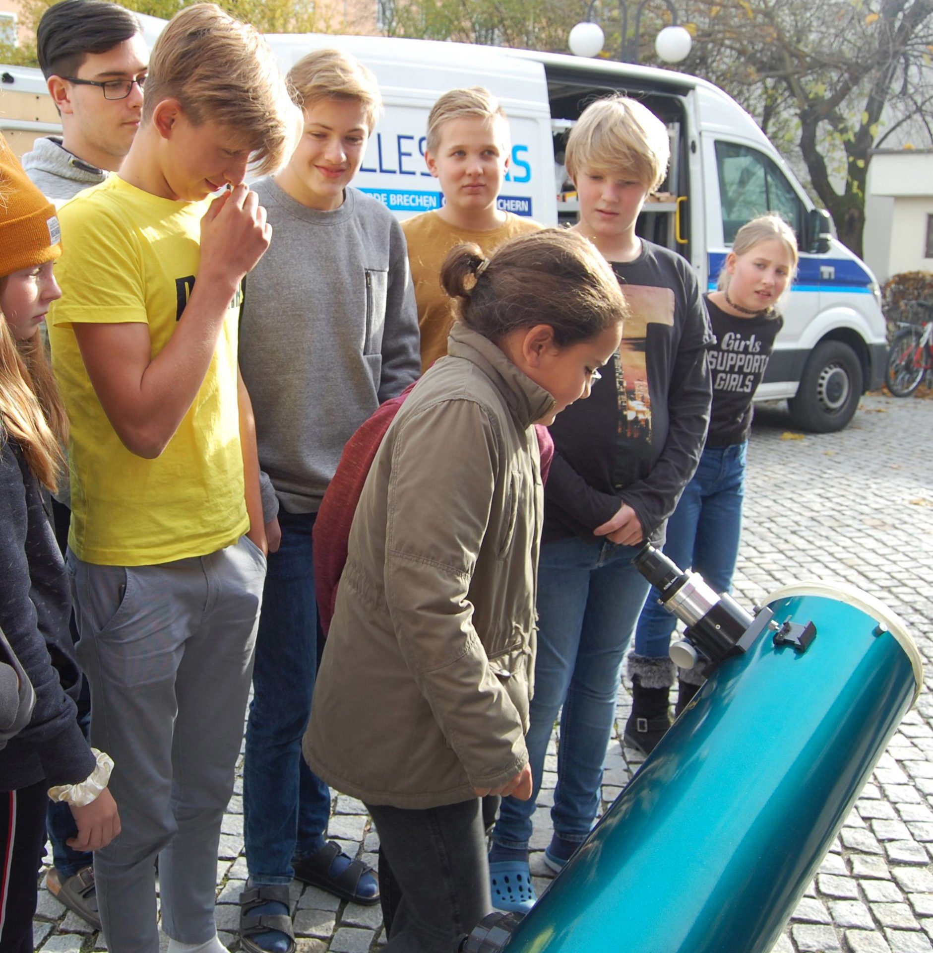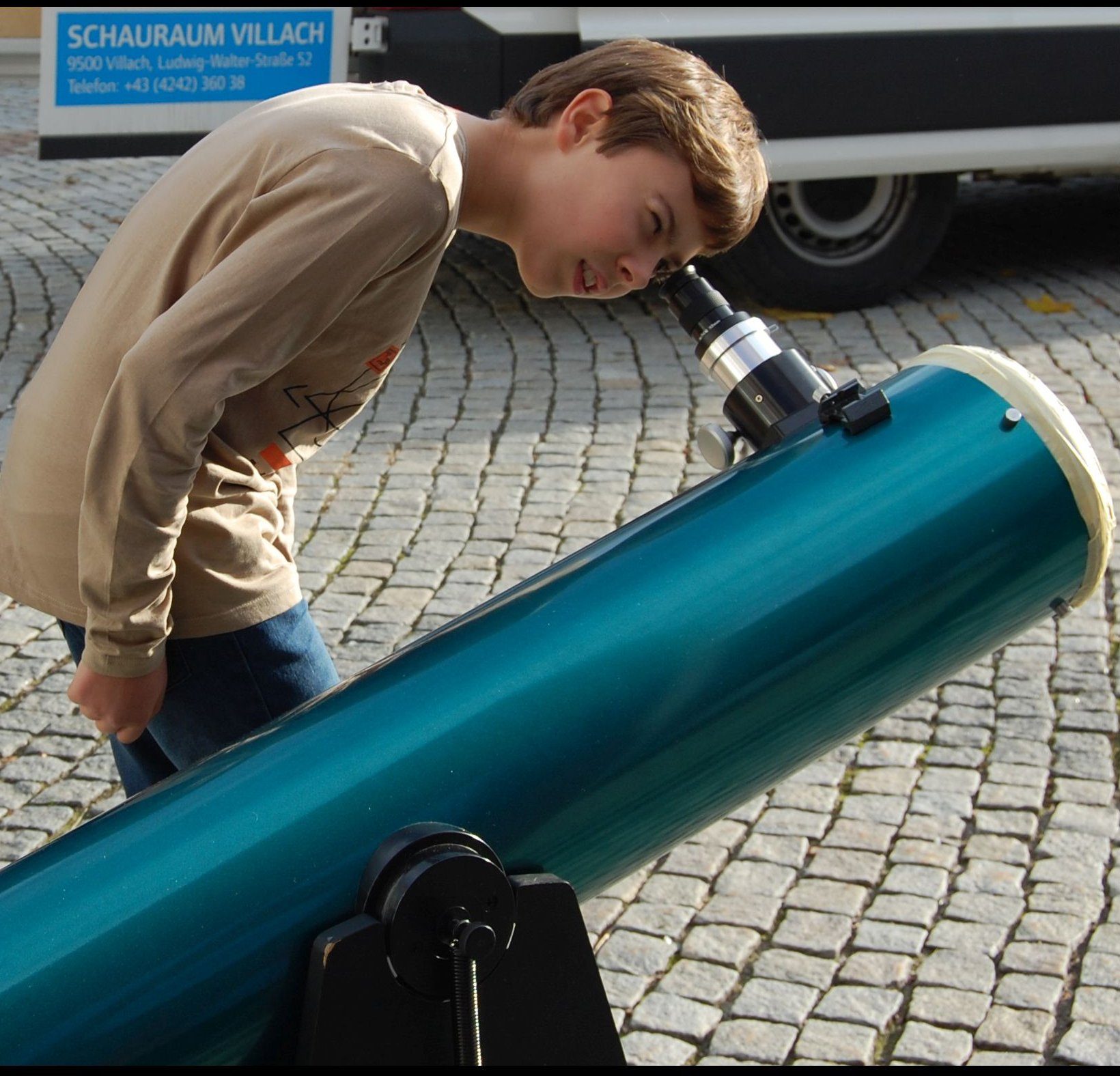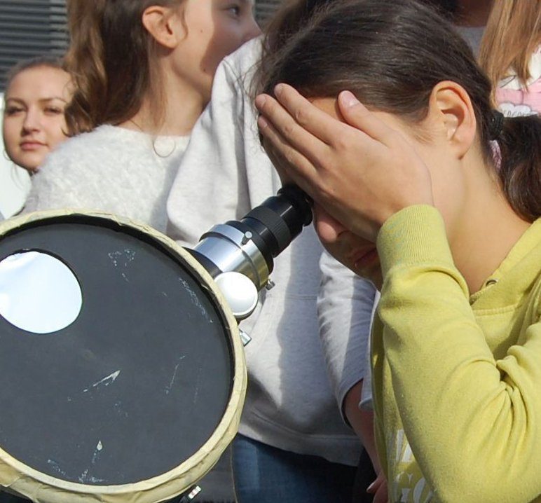 15. November 2019Mit ausgesprochenem Wetterglück konnte gestern (Montag 11.11.2019) der Merkurtransit vorm Haupteingang der Spittaler Gymnasien perfekt beobachtet werden. Der „Schulastronom des BRG“, Mag. Michael Samitz, hatte den Lichteinlass seines 8-Zoll-Dobson-Teleskopes zuvor gemeinsam mit SchülerInnen der 4G mit einer speziellen Beobachtungsfolie versehen und dann das Gerät sowie ein Solarskop (Projektionsschirm) der Schule in Richtung Sonne in Position gebracht. Kurz vor Beginn des seltenen Spektakels lichteten sich die Wolken und etliche LehrerInnen und SchülerInnen, die noch Nachmittagsunterricht hatten konnten einen Blick auf den kleinen schwarzen Punkt werfen, der sich gemächlich vom Rand der Sonnenscheibe nach innen bewegte.