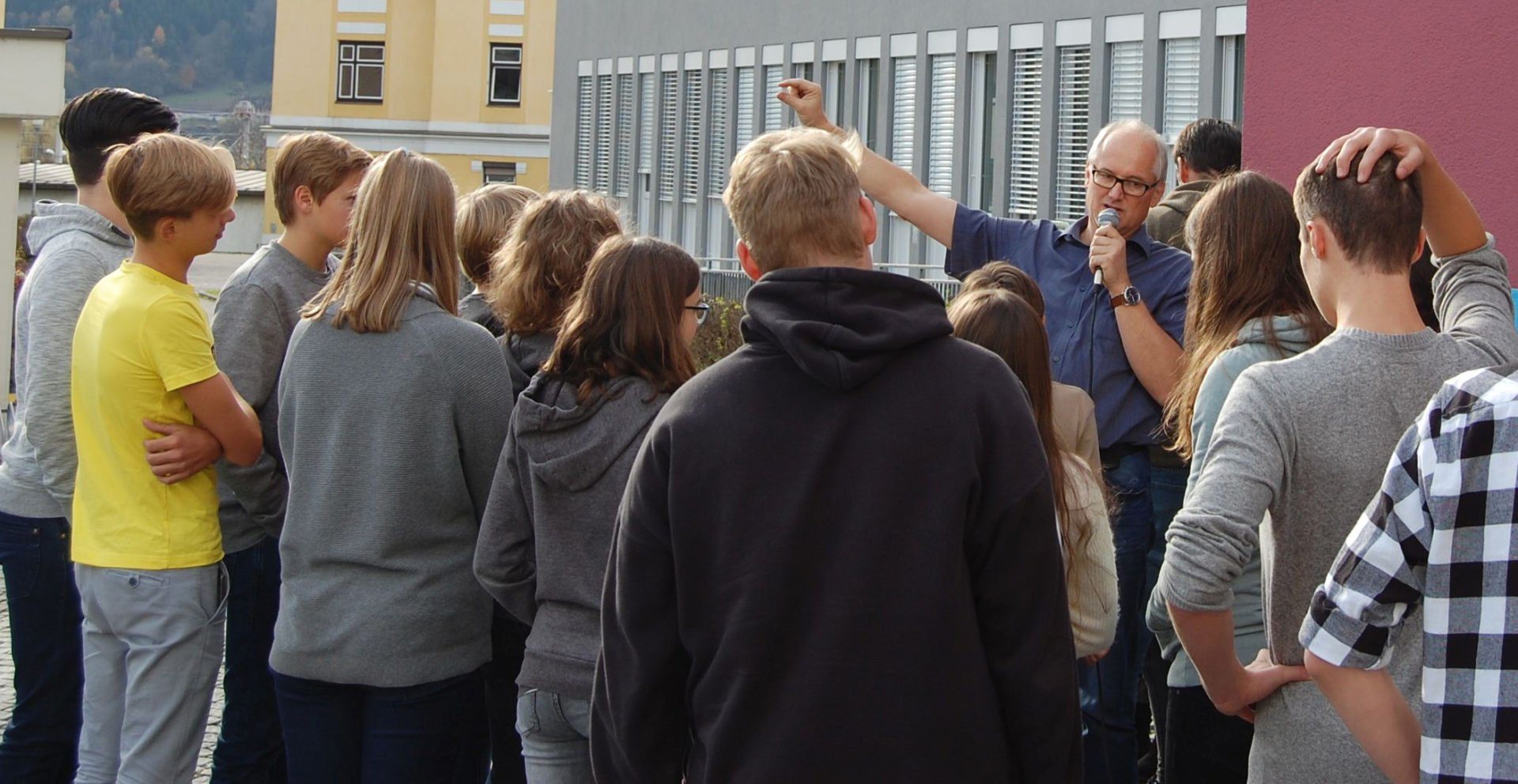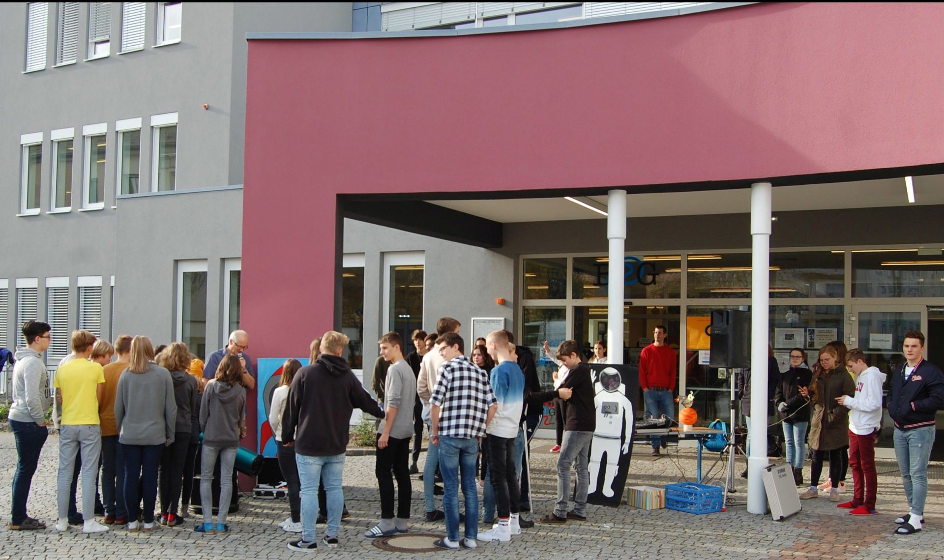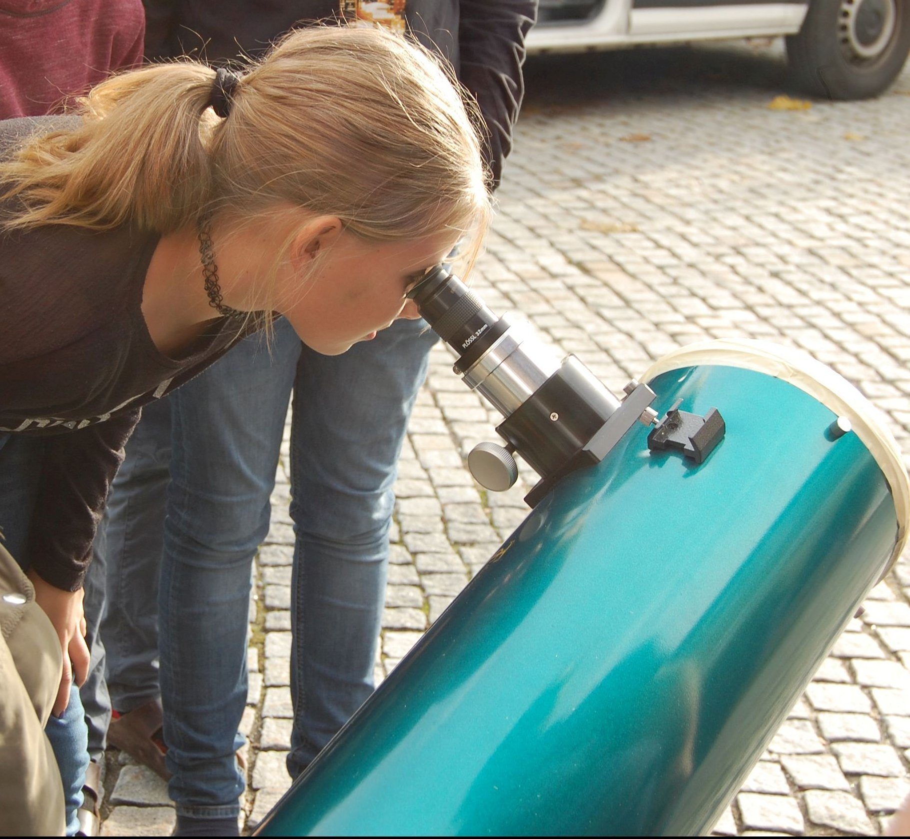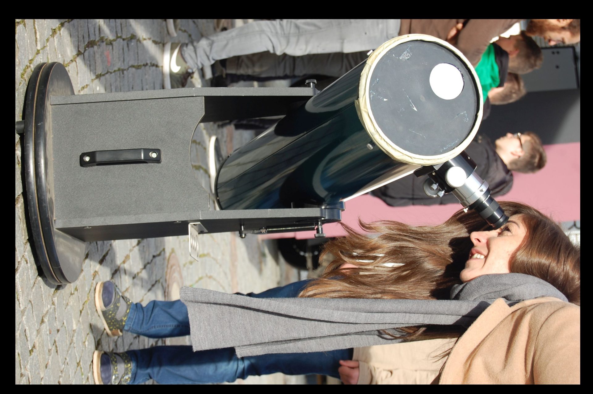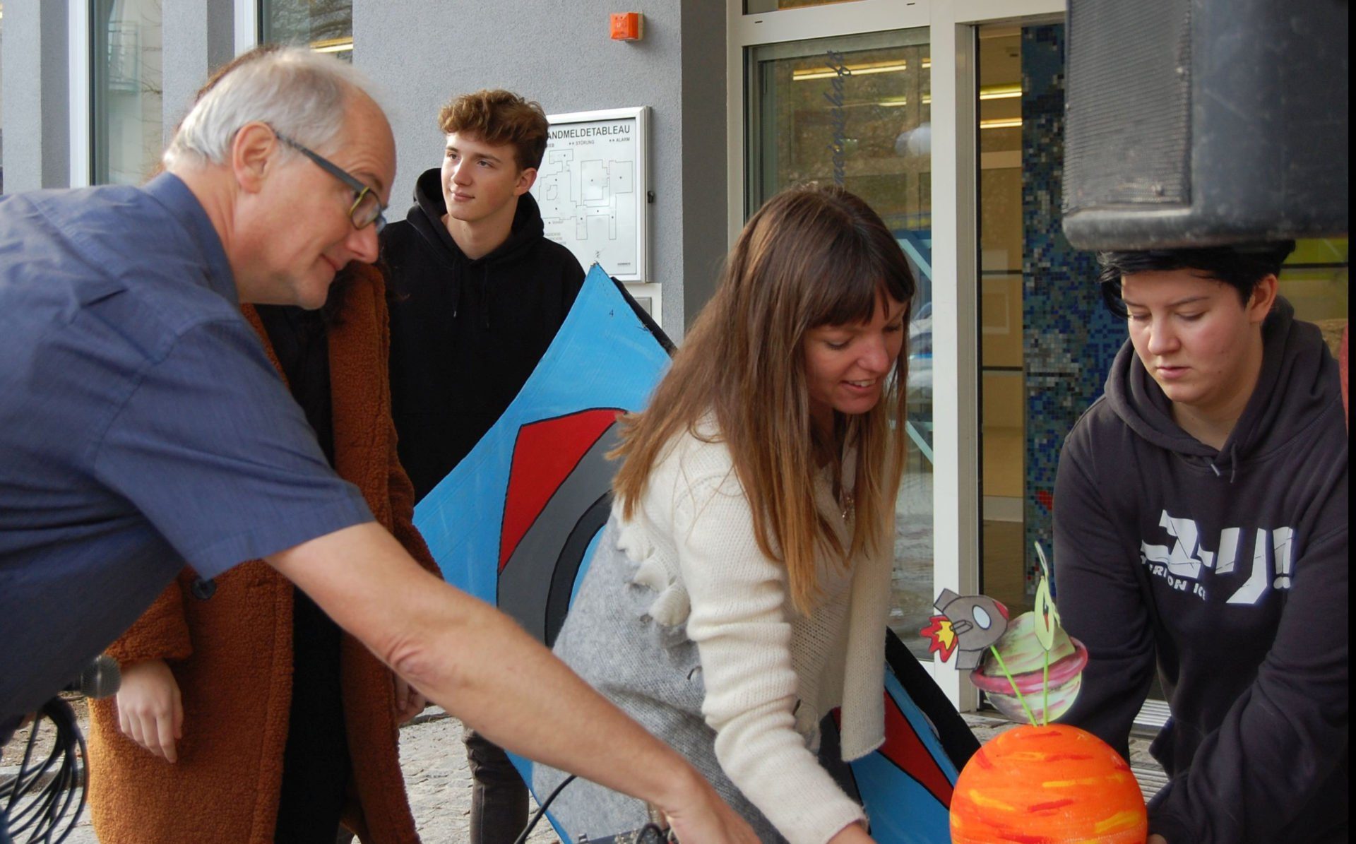 15. November 2019Mit ausgesprochenem Wetterglück konnte gestern (Montag 11.11.2019) der Merkurtransit vorm Haupteingang der Spittaler Gymnasien perfekt beobachtet werden. Der „Schulastronom des BRG“, Mag. Michael Samitz, hatte den Lichteinlass seines 8-Zoll-Dobson-Teleskopes zuvor gemeinsam mit SchülerInnen der 4G mit einer speziellen Beobachtungsfolie versehen und dann das Gerät sowie ein Solarskop (Projektionsschirm) der Schule in Richtung Sonne in Position gebracht. Kurz vor Beginn des seltenen Spektakels lichteten sich die Wolken und etliche LehrerInnen und SchülerInnen, die noch Nachmittagsunterricht hatten konnten einen Blick auf den kleinen schwarzen Punkt werfen, der sich gemächlich vom Rand der Sonnenscheibe nach innen bewegte.