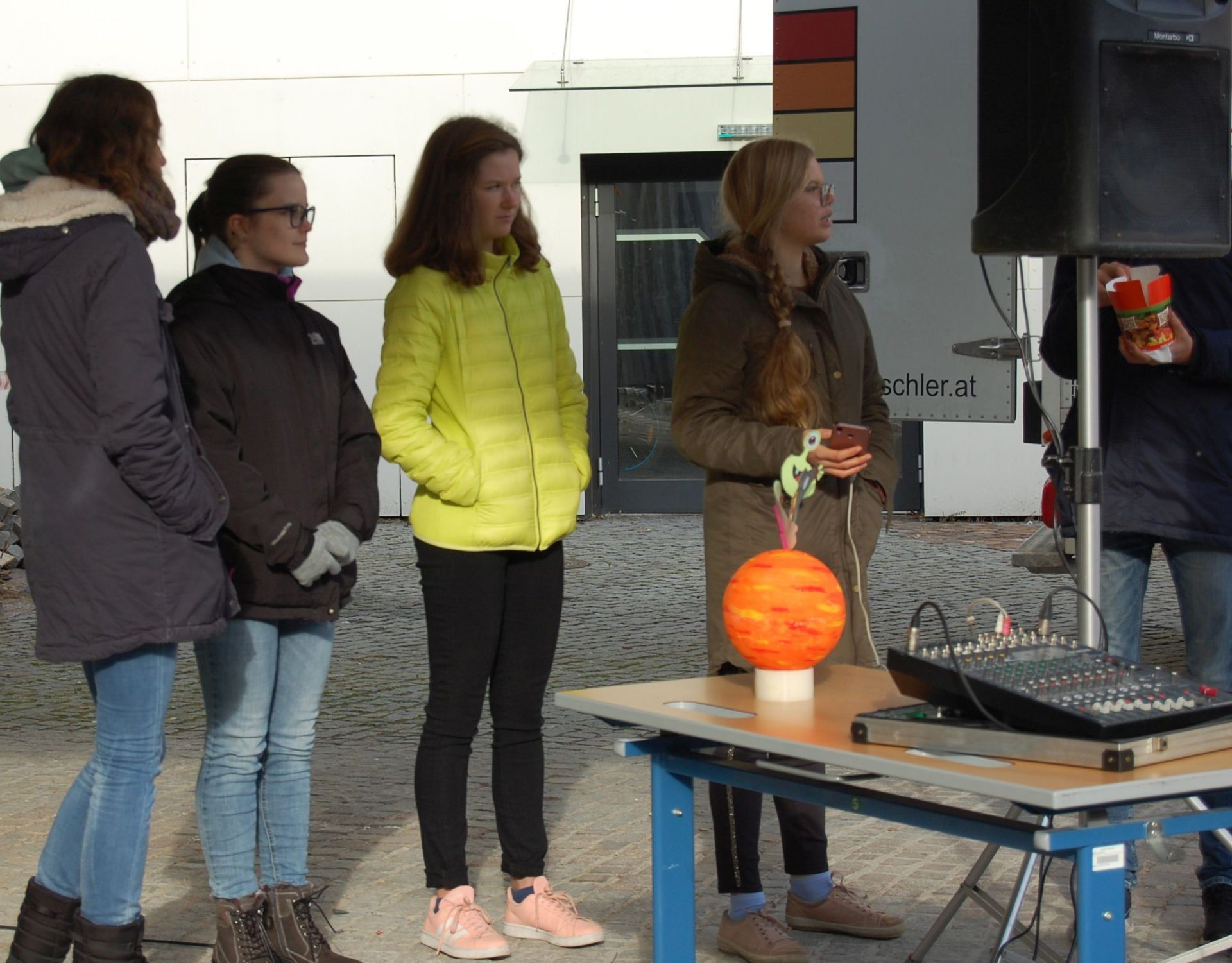 Schülerinnen der achten Klassen spielten als DJanes Musik mit Bezug zu Sonne bzw. Planeten als Background für die Beobachtungsszenerie.