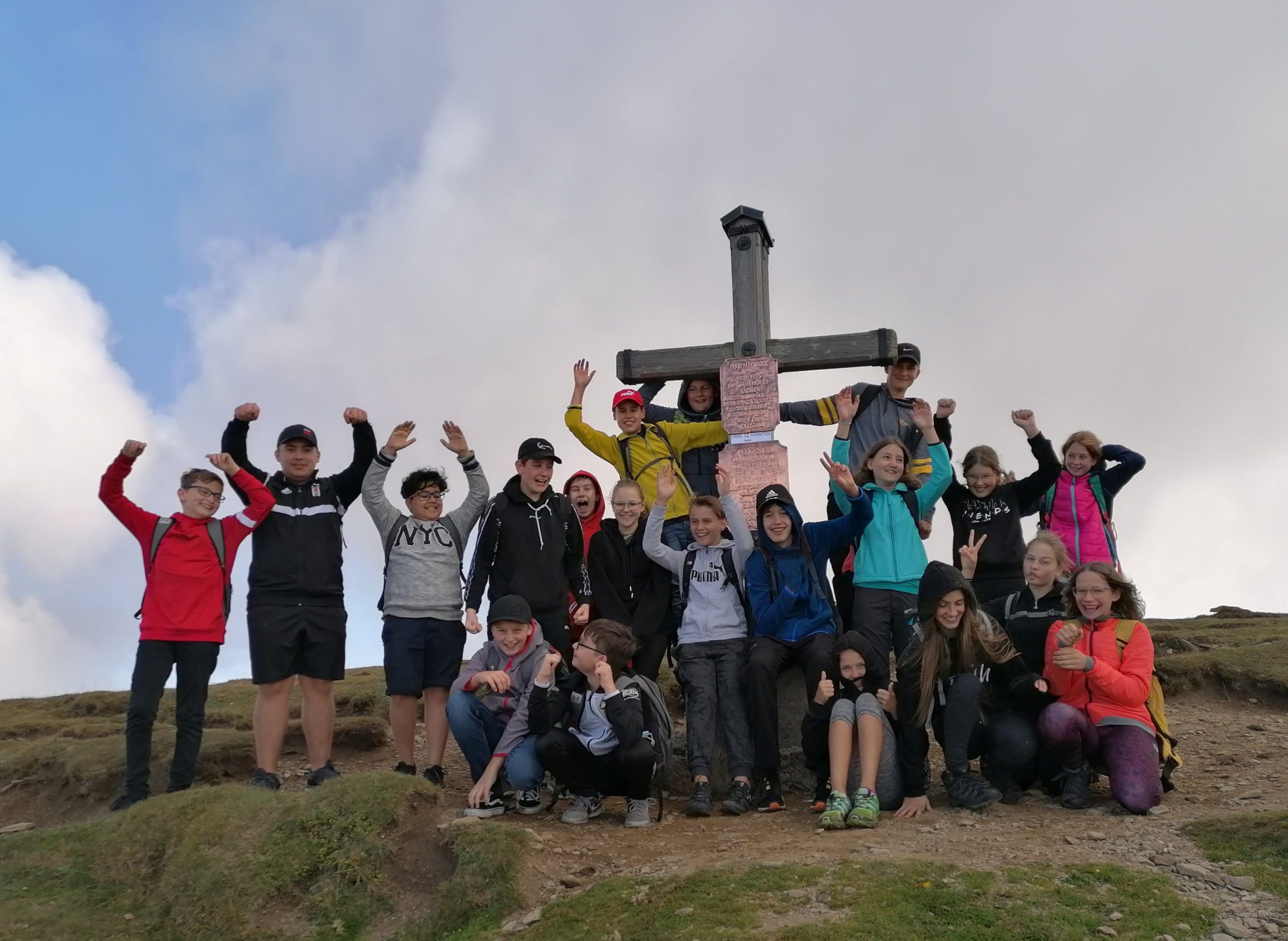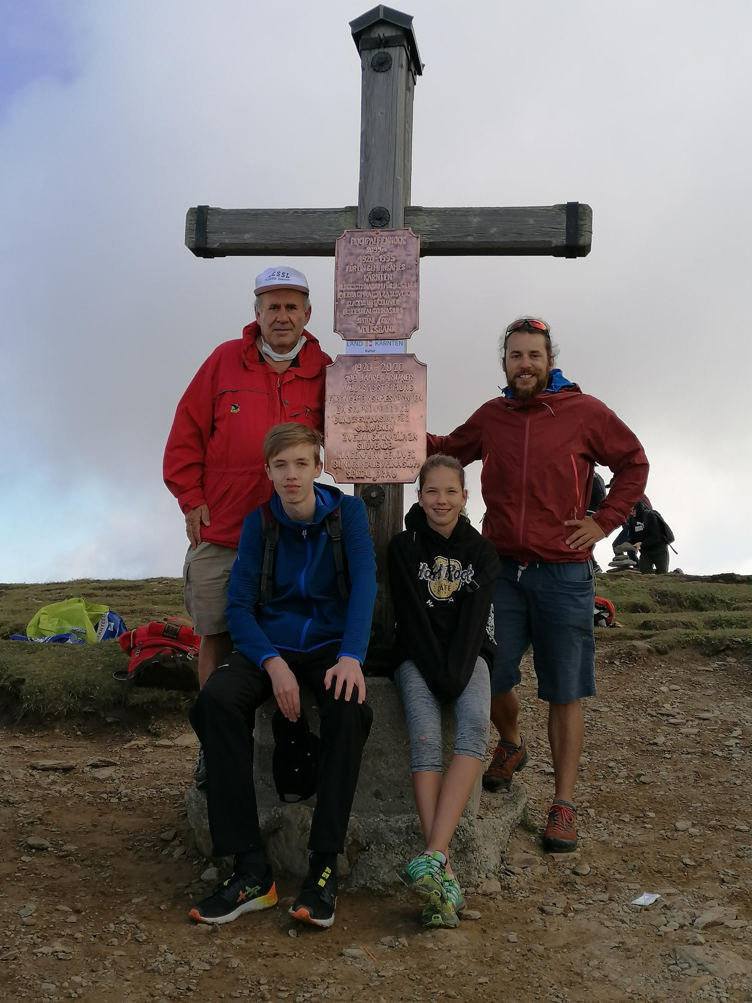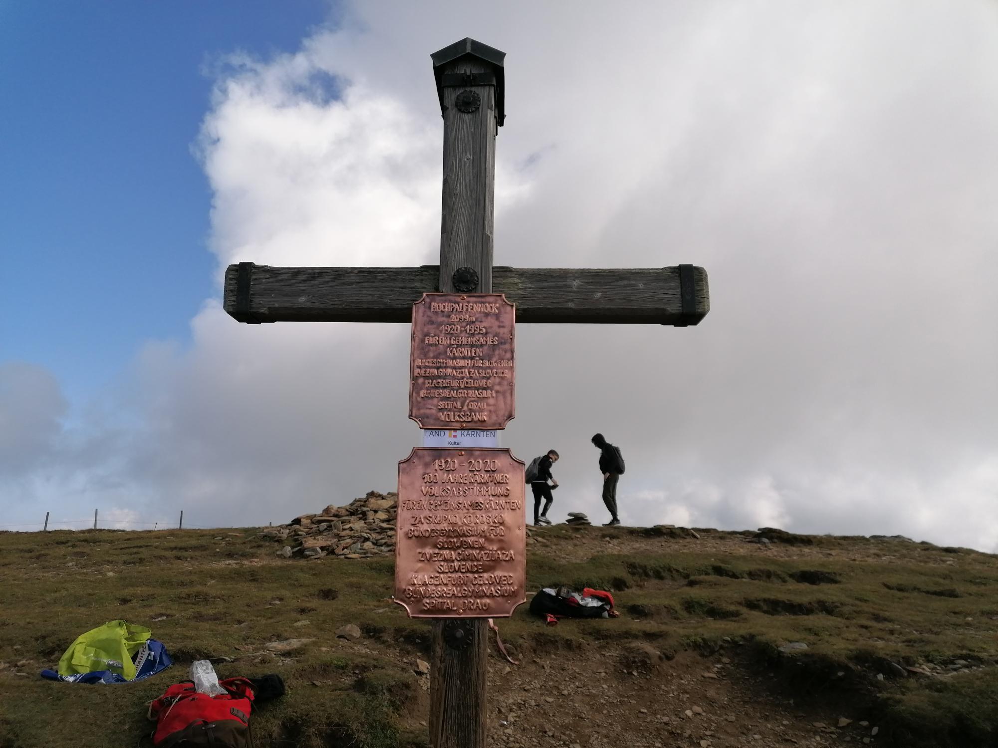 Mit von der Partie war Mag. Andreas Lackner und Herr Prof. Mag. Josef Leitner, den eine besondere Geschichte mit diesem Berg verbindet. Am Gipfel erzählte er den Schülerinnen und Schülern voller Begeisterung, wie er vor nun 25 Jahren, zum 75. Jahrestag der Kärntner Volksabstimmung, ein Projekt mit dem Bundesgymnasium für Slowenen in Klagenfurt in Kooperation mit dem BRG Spittal/Drau plante und umsetzte. Am Hochpalfennock gab es zu dieser Zeit noch kein Gipfelkreuz, deshalb kam ihm die Idee, als Zeichen für ein geeintes und volksgruppenübergreifendes Kärnten an dieser Stelle ein Kreuz mit einer Gedenktafel zu errichten. Es fanden sich schnell viele Freiwillige, unter anderem Herr Ing. Ludwig Raindl aus Seeboden, der das Kreuz baute und zur Verfügung stellte, sowie einige Schülerinnen und Schüler der beiden Schulen, die das notwendige Material und das Gipfelkreuz von der Sommereggeralm ca. 400 Höhenmeter über Wanderwege bis auf den Gipfel schleppten und es dort mit vereinten Kräften errichteten.