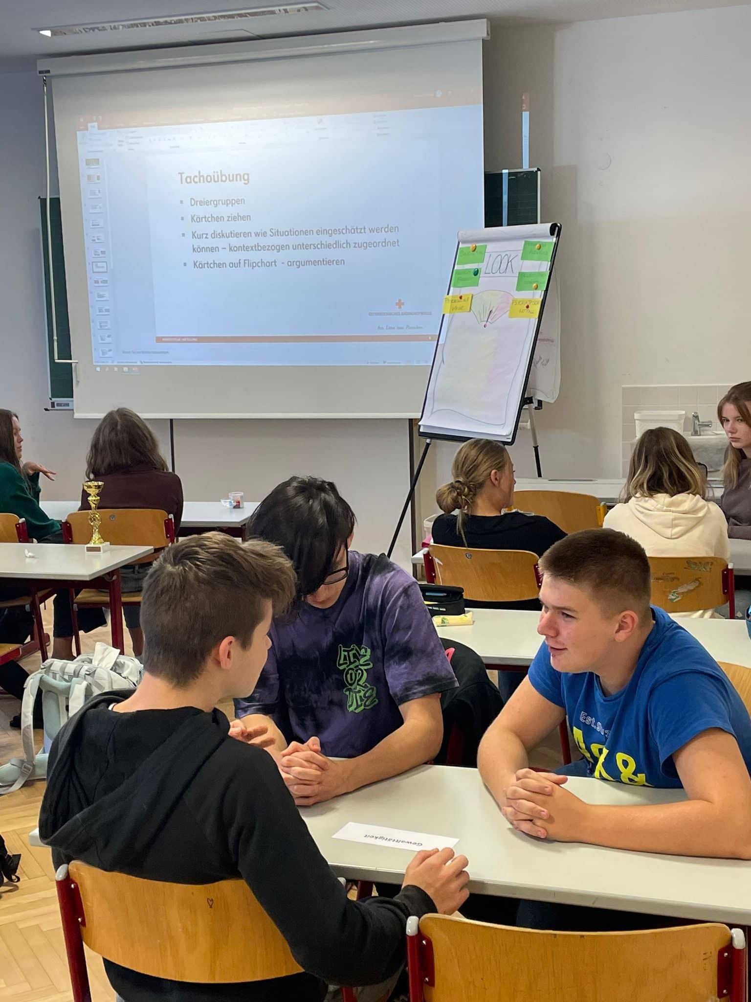16. November 2022Daniela Fischer vom Österreichischen Jugendrotkreuz leitete einen dreistündigen Workshop zum Thema „Psychische Erste Hilfe“ in der 5A. Im Plenum wurden grundsätzliche Informationen über die Möglichkeiten, die jede und jeder im Umgang mit psychisch belasteten Personen im Umfeld hat, besprochen. In Kleingruppen wurde auf konkrete Situationen eingegangen.