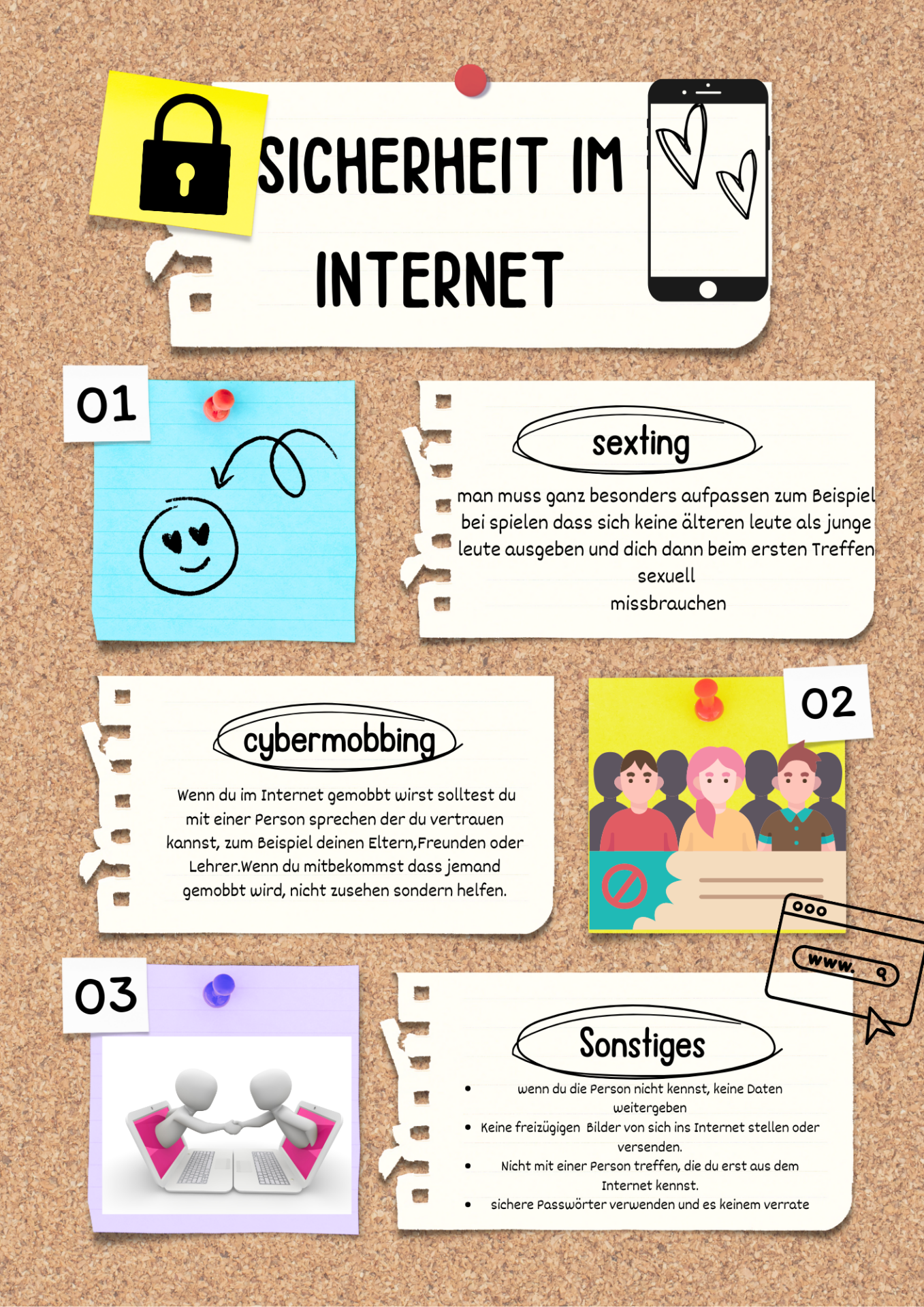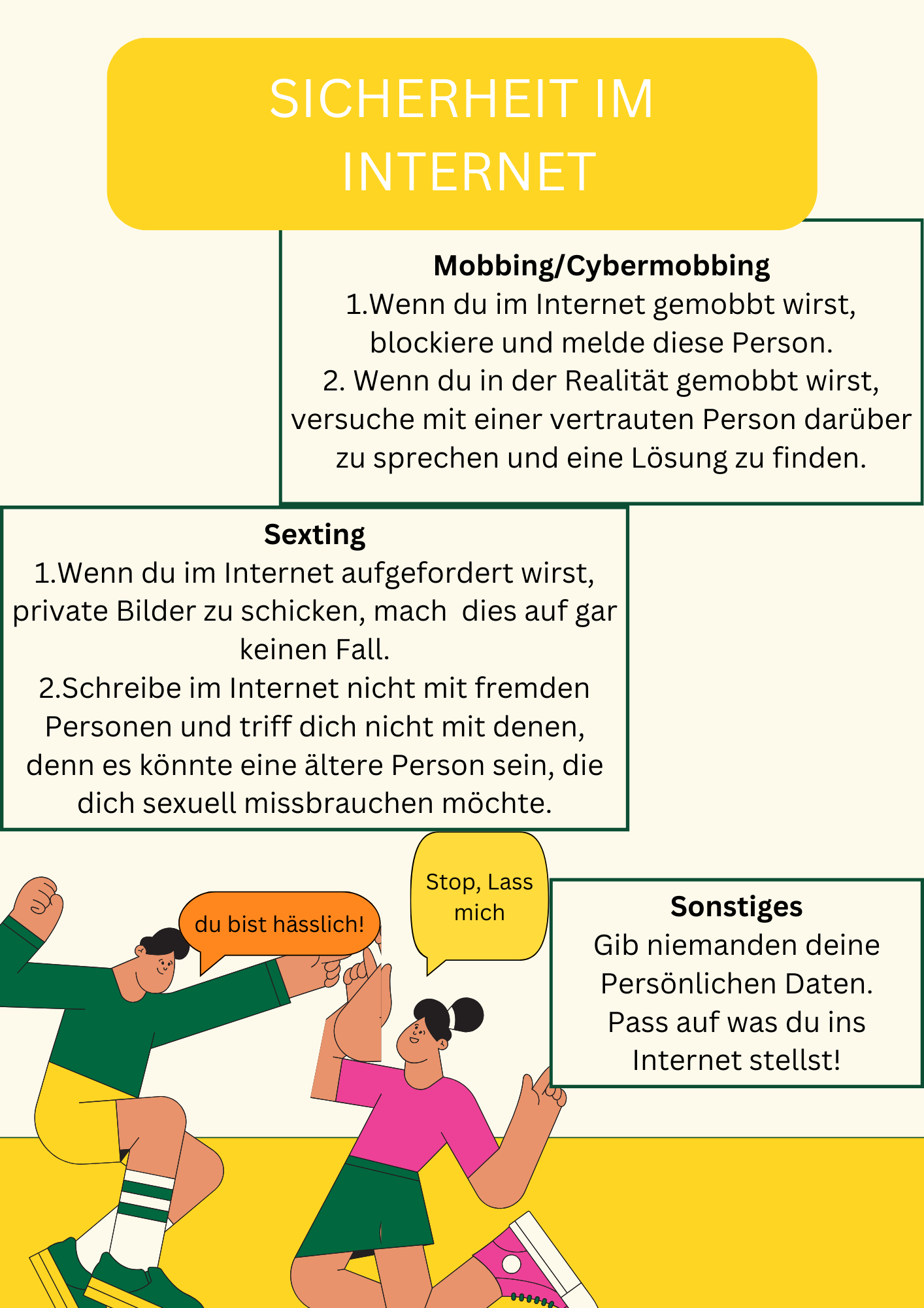 19. März 2024Die Schülerinnen und Schüler der 3ag, 3bg, 3arl und der 3drl_brl setzten sich im Unterricht „Digitale Grundbildung“ mit dem Thema Cybermobbing, Cybergrooming und Sexting auseinander. In Gruppen wurden diskutiert, mit welchen Botschaften man andere auf die Gefahren im Internet hinweisen kann. Die Ergebnisse wurden mit selbst gestalteten, digitalen Plakaten festgehalten.