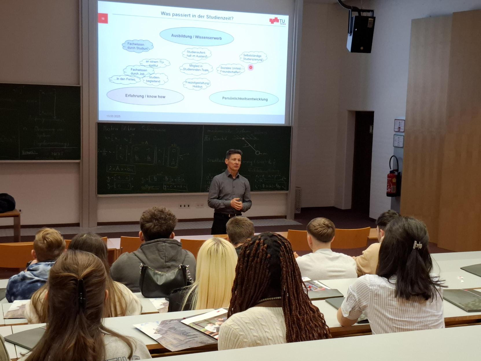 Die FH Joanneum stellte uns am Donnerstagvormittag die folgenden drei Studienrichtungen vor: Nachhaltiges Lebensmittelmanagement, Industrial Design und Luftfahrt. Danach wurden die Schüler:innen zu einem Mittagessen eingeladen. Anschließend ging es weiter zur TU Graz, wo die Studienrichtungen Maschinenbau inkl. Racingteam und Verfahrenstechnik präsentiert wurden.