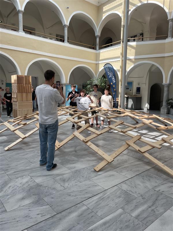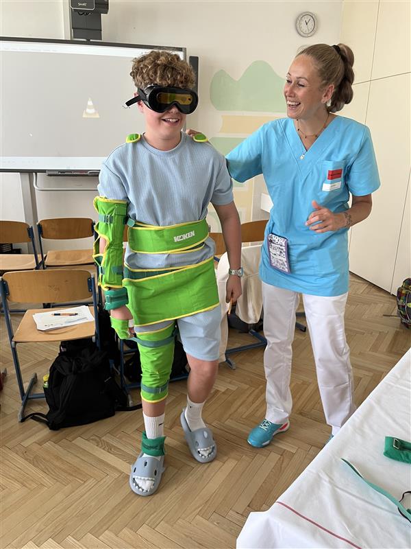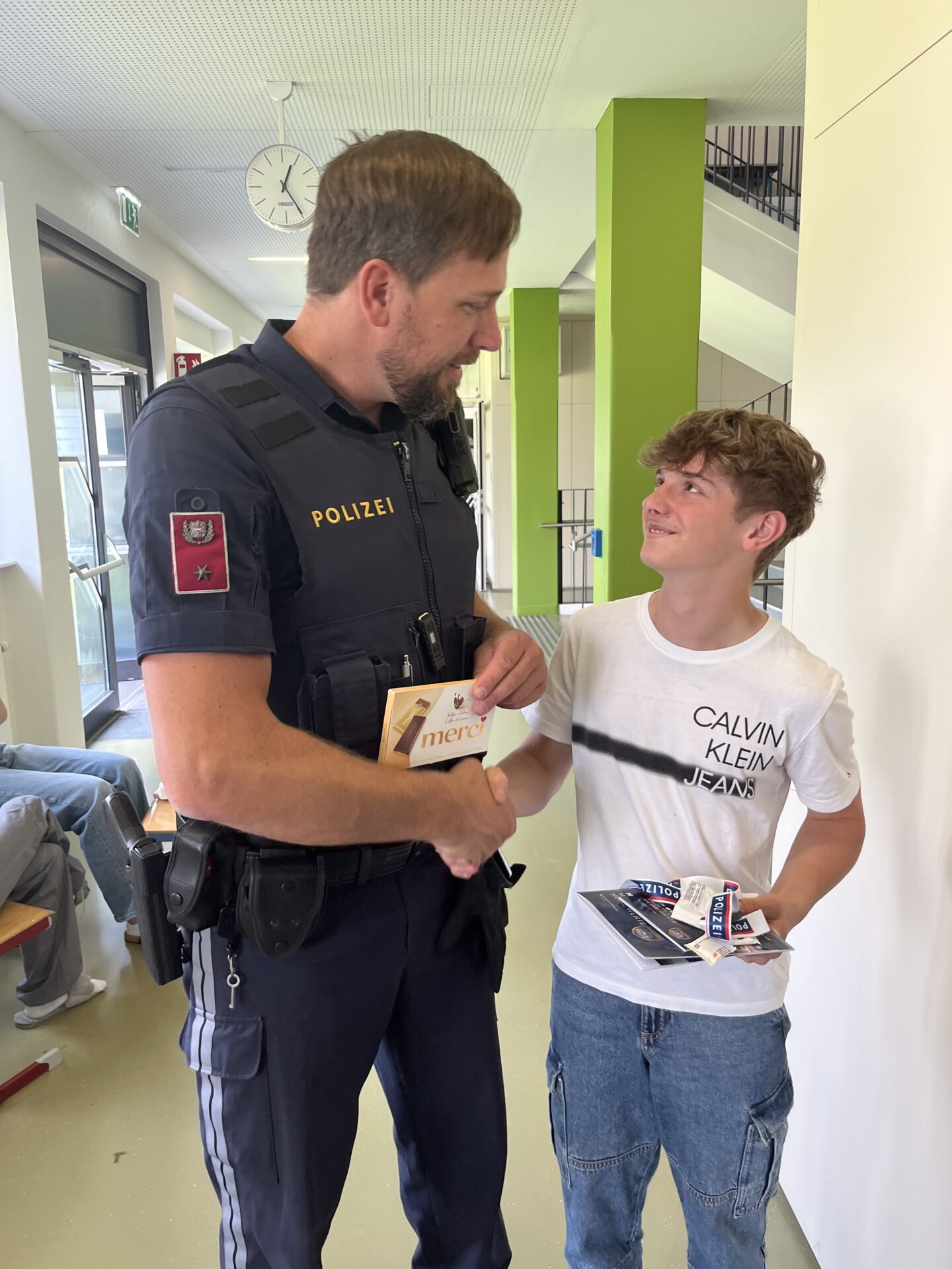 23. Juni 2025Am 10. und 11. Juni fanden für die 4. Klassen des Porciagymnasiums zwei großartige Workshops statt. Austragungsort dafür war am Montag der FH Campus Spittal („Schule meets FH“), wo sich die Brg-Klassen in Gruppen mit den Themen Brückenbau/Architektur, Sozialer Arbeit, Wirtschaftsingenieurwesen und Globalisierung auseinandersetzten. Am Dienstag wurden die Workshops für die BG und CLD-Klassen im Porciagymnasium unter dem Titel „Helping Hands“ angeboten. Vertreter:innen der Schule für Gesundheit, der Polizei, der Schule Seebach sowie der Bildungs- und Berufsorientierung Kärnten brachten vor Ort unseren Schüler:innen ihren Berufsalltag näher. Bei einer Liegestütze-Challenge der Polizei in voller Einsatzmontur ging Samuel Winkler aus der 4ar mit 39(!) Liegestützen als klarer Sieger hervor. Inspektor Friedrich überreichte ihm dafür als Anerkennung eine Tafel Schokolade.