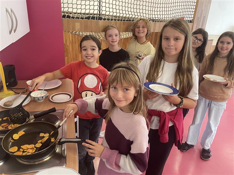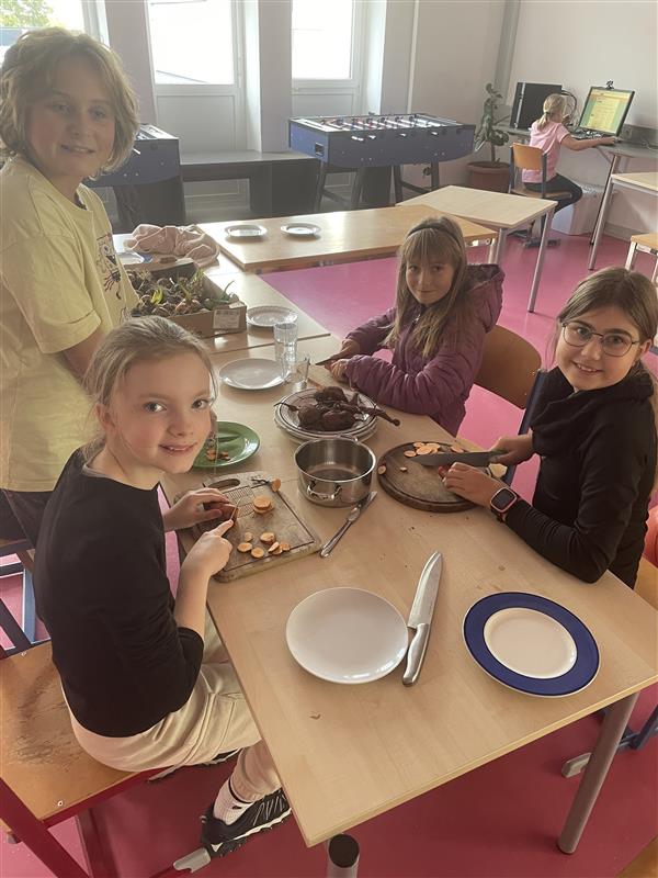 Aus einer gekauften halbierten und in Wasser eingelegten Süßkartoffel sprossen etliche Triebe, die wir, als sie ca. 10 cm lang waren, in Wasser legten, bis sie Wurzeln bekamen. In diesem Stadium setzten wir sie in Töpfchen. Nach gutem Wachstum übersiedelten wir die Pflanzen in den Schulgarten. Jetzt haben wir die Knollen gemeinsam mit Zwiebeln und „Normalen“ Kartoffeln geerntet – es waren etliche in der Erde – und sie heute in der Tabe als Chips mit Sauerrahm genossen.