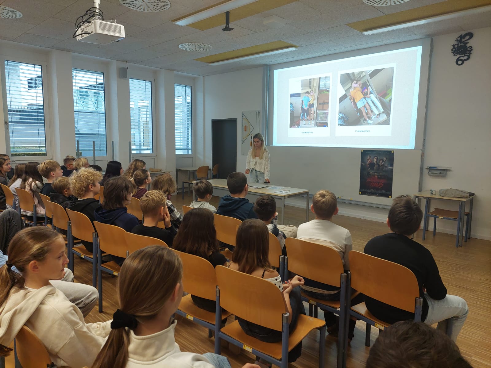 14. November 2025Am Freitag, dem 7. November 2025, durften einige Klassen des Porciagymnasiums Spittal/Drau Marii Weichsler (22), eine Schauspielerin und Hauptdarstellerin aus dem Film „Das schaurige Haus“, begrüßen und kennenlernen. Mithilfe einer PowerPoint-Präsentation erzählte sie vom Casting-Prozess, der beinahe ein Jahr gedauert hatte, und davon, wie sie zu ihrer Rolle der „Ida“ im Film gekommen war. Damals war sie erst 15 Jahre alt.