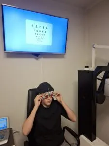 Zunächst wurde mit einem Autorefraktometer unsere Sehstärke gemessen, danach untersuchte ein Aberrometer die Hornhautoberfläche. Dabei zeigte sich bei unserem Versuchskaninchen Matteo eine kleine Sehschwäche. Wir haben auch erfahren, dass man zwischen objektiver (Messung durch Geräte) und subjektiver Refraktion (Überprüfung durch den Optiker) unterscheidet und dass Sehen viel mehr ist, als nur Buchstaben zu erkennen.