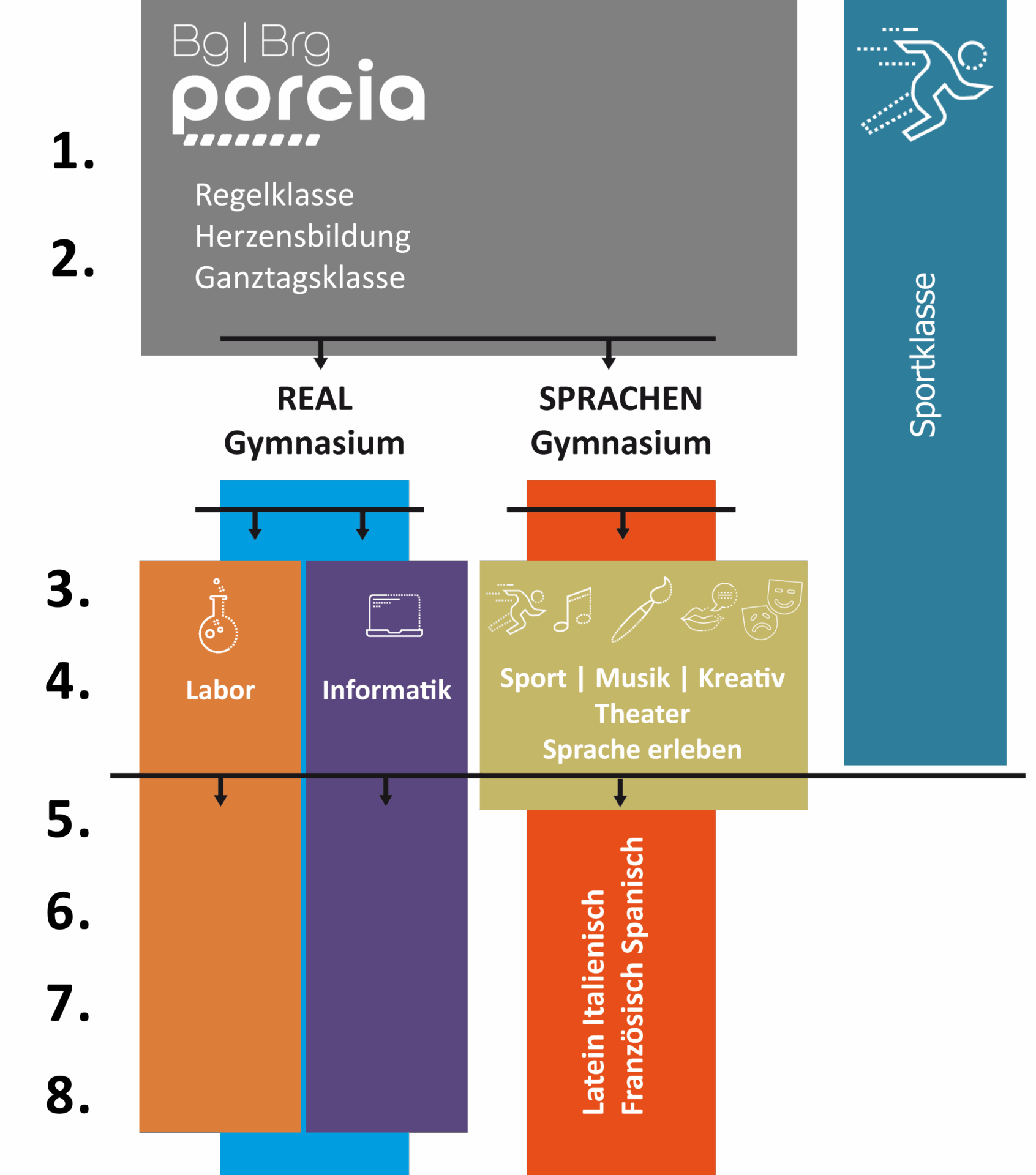 Im Laufe der 2. Klasse wählen die SchülerInnen für die 3. bzw. 4. Klasse zwischen dem Real-Gymnasium und dem Sprachen-Gymnasium.
